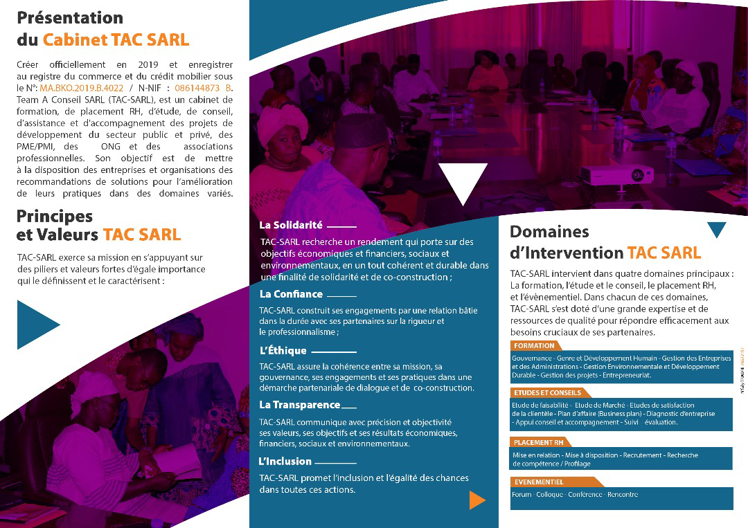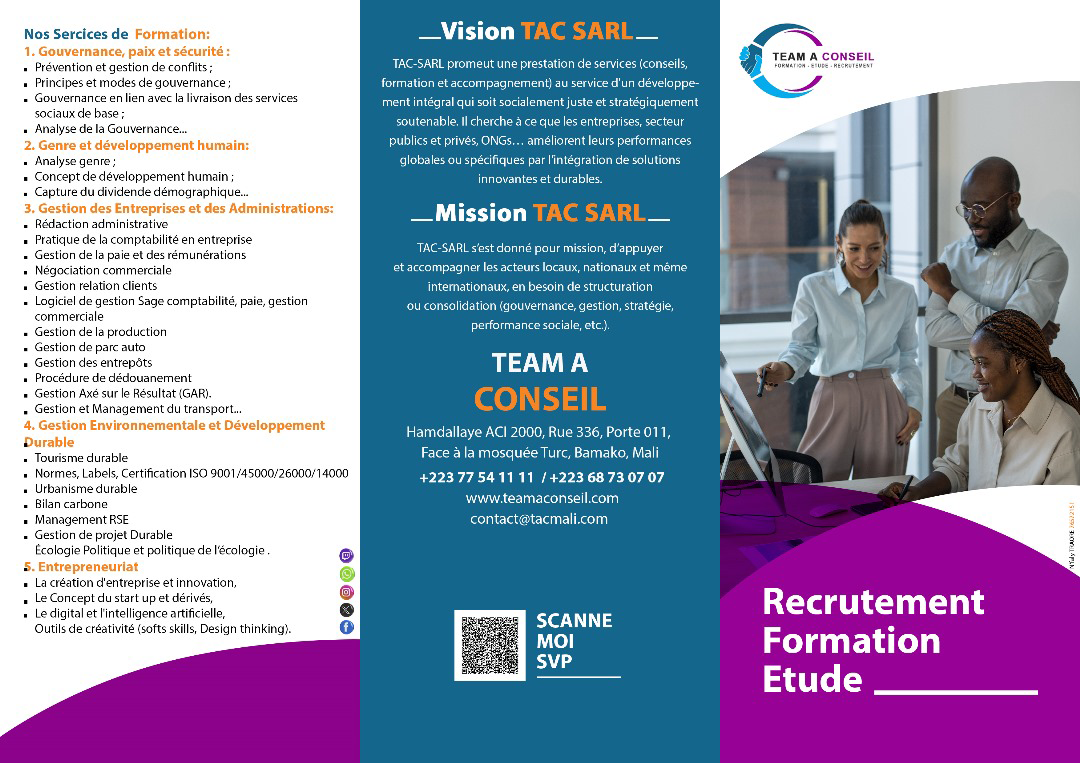 Créé officiellement en 2019 et enregistré au Registre du Commerce et du Crédit Mobilier (RCCM) sous le numéro MA.BKO.2019.B.4022, le Cabinet TAC SARL (Team A Conseil SARL) est un cabinet spécialisé dans la formation, le placement des ressources humaines, les études et le conseil stratégique.